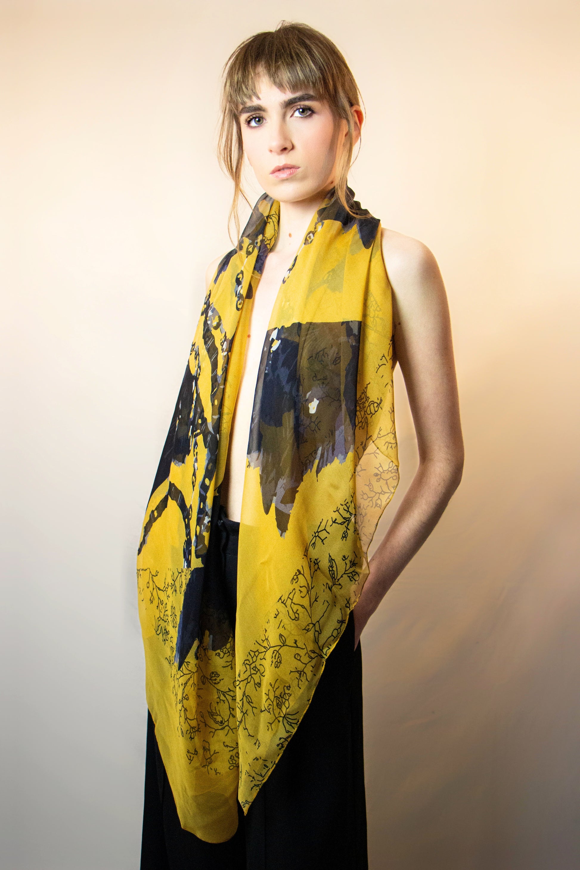 Les fleurs sauvages sont au premier plan de cette étole très légère, toute en volume et en douceur. Au foisonnement des perles répondent les sequins éclatants et les broderies imprimées du motif. Un bric-à-brac chaleureux, ocre et chaud comme un après-midi de juin.