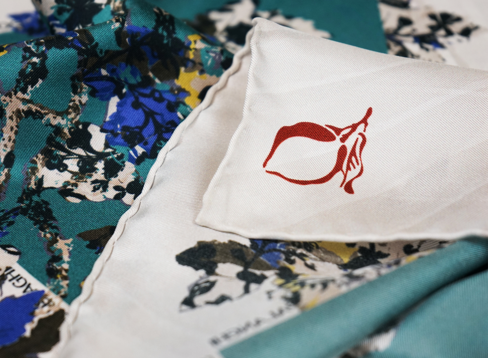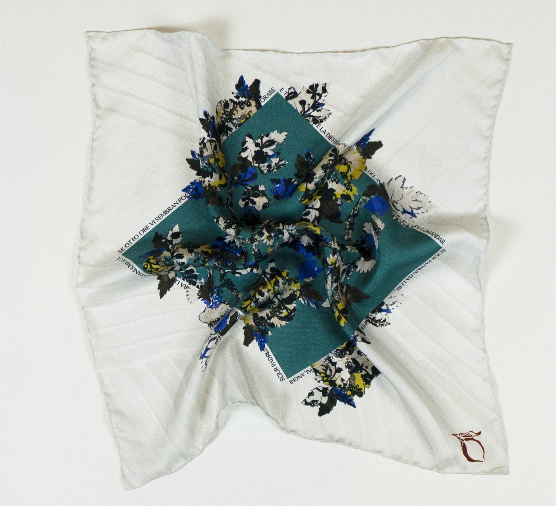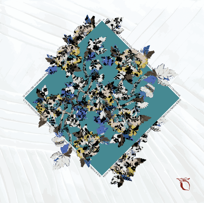 Ce qui rend le carré Azzurro unique : son motif tout en volumes, qui rend hommage aux chants de protestation et au combat politique des émondeuses italiennes.