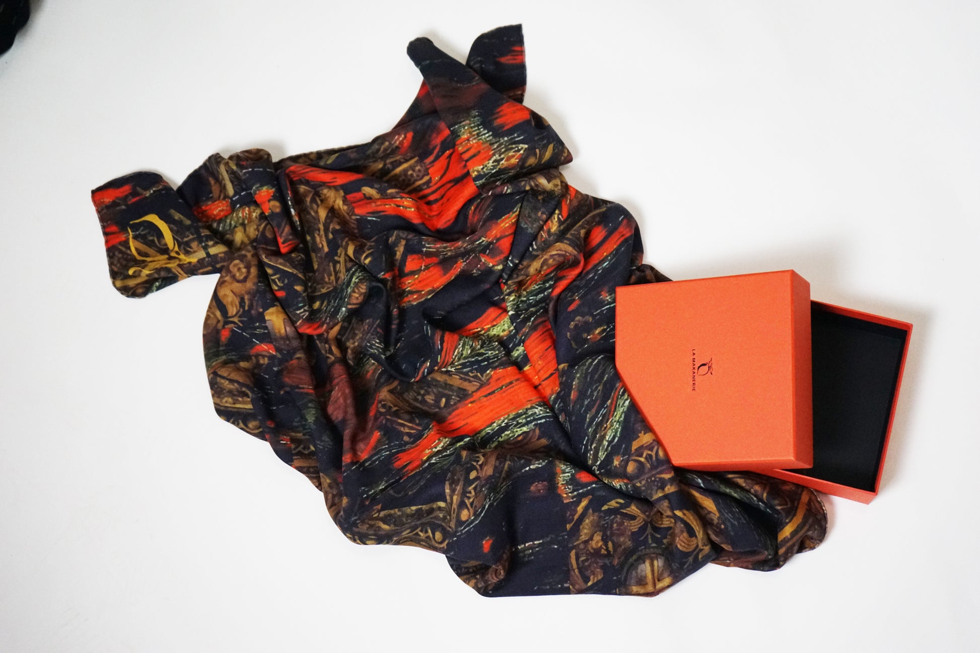 Le motif s’inspire d’un palais intérieur aux mille ornements, dont les secrets ne peuvent être dévoilés qu’à celui qui porte le foulard au plus proche de soi.