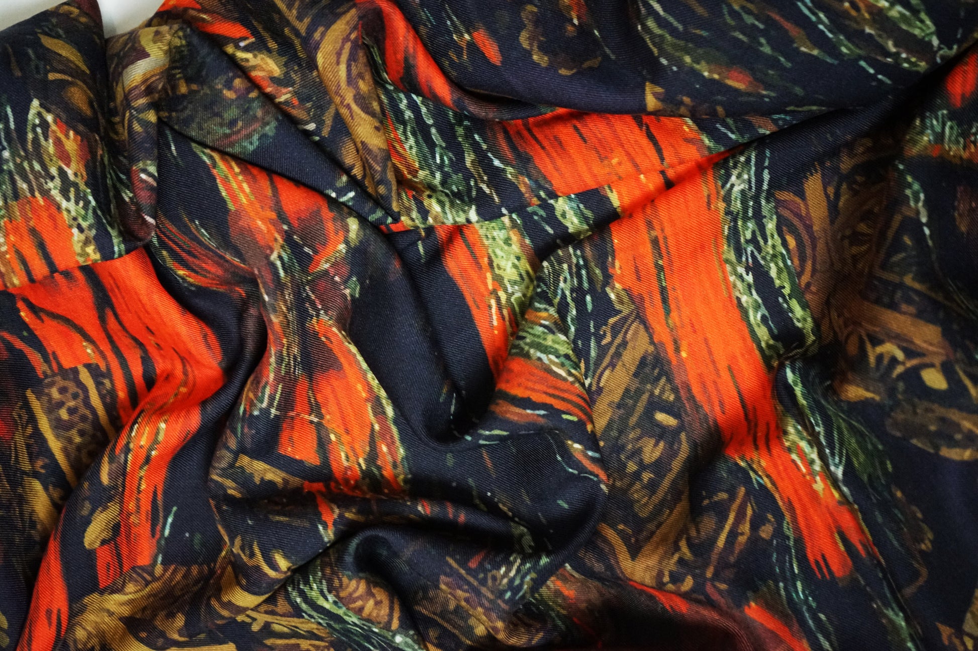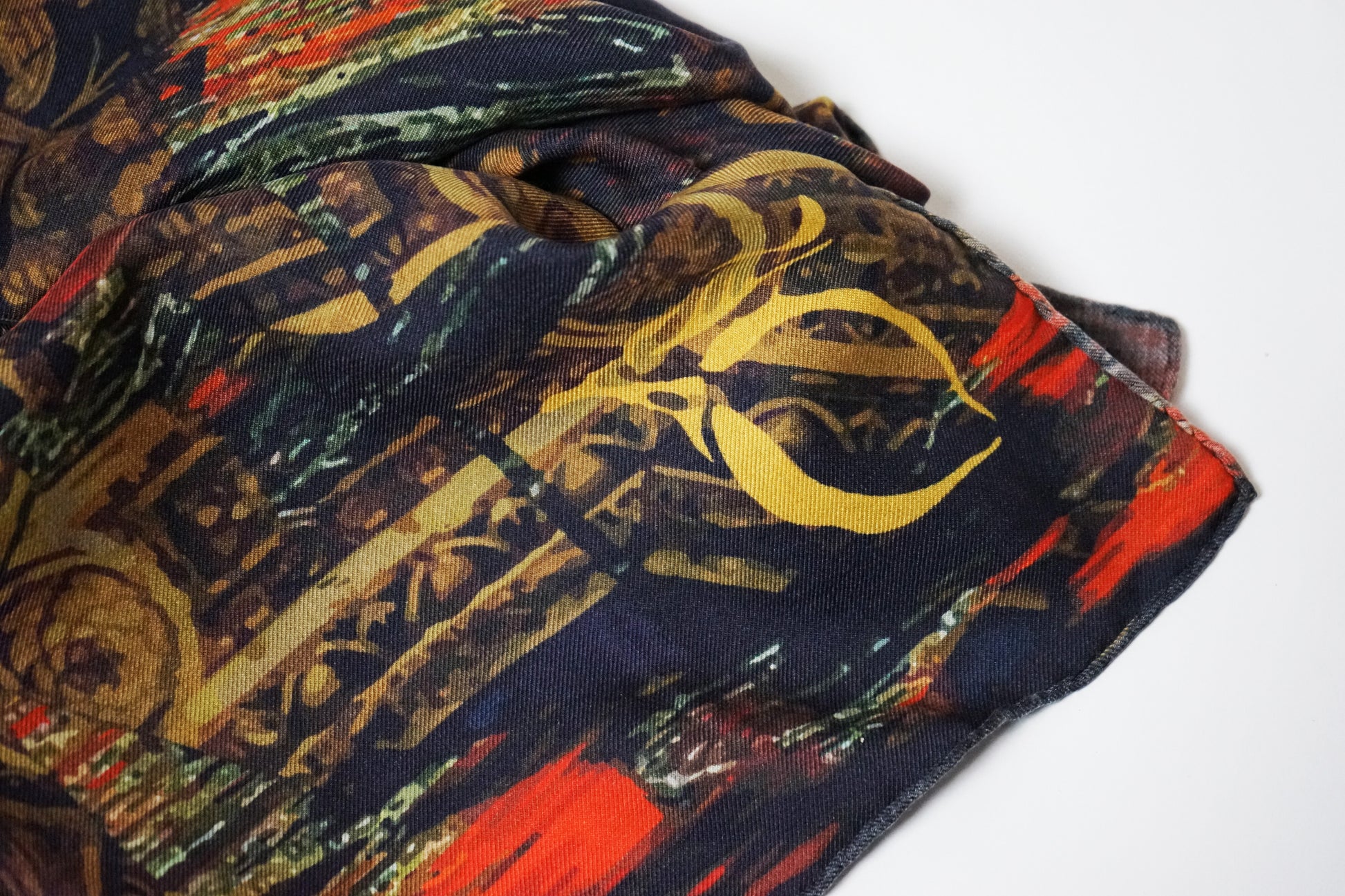 100 % soie. Nettoyage à sec uniquement. Repasser sans vapeur à une température maximale de 110° avec un tissu en coton léger entre le fer et le foulard. Ne pas sécher en machine. Ne pas utiliser d'eau de Javel.